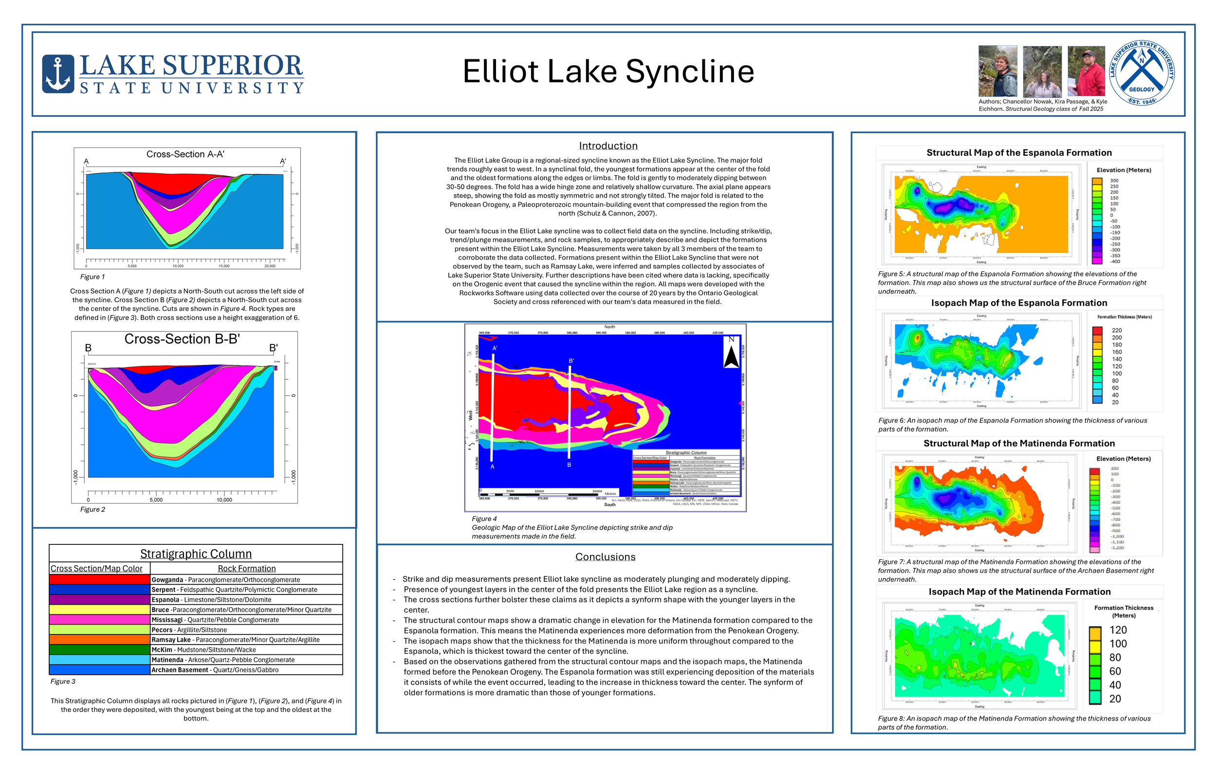 Half way into the semester i was able to go on my first major field excursion around the Elliot Lake region of Ontario, Canada. My class was split into groups of 3 to collect data on 12 locations within the Elliot Lake syncline. The whole project taught me how to look at the Big picture of Geologic processes and how they can shape the geography, ecology, and economy of a region. The culmination of the project was a scientific seminar-style poster. The results are those of a student, but generally good practice for the real deal later in my academic career.